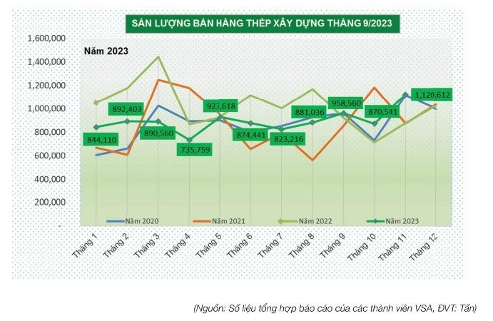 Theo Hiệp hội Thép Việt Nam (VSA), trong tháng 11 năm 2023, tiêu thụ thép xây dựng đạt 1,1 triệu tấn, tăng 29% so với tháng trước và tăng 28% so với cùng kỳ năm 2022. Trong đó, xuất khẩu thép xây dựng đạt 145.328 tấn, tăng 49% so với tháng 11/2022. Tính chung 11 tháng năm 2023, tiêu thụ thép xây dựng đạt 9,7 triệu tấn, giảm 13,5% so với cùng kỳ năm 2022, chiếm 41% bán hàng thép thành phẩm. Trong đó, xuất khẩu đạt 1,56 triệu tấn, giảm 23%.